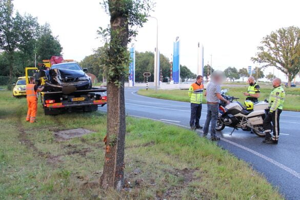 Auto tegen boom op de Rijksweg in Nijeveen