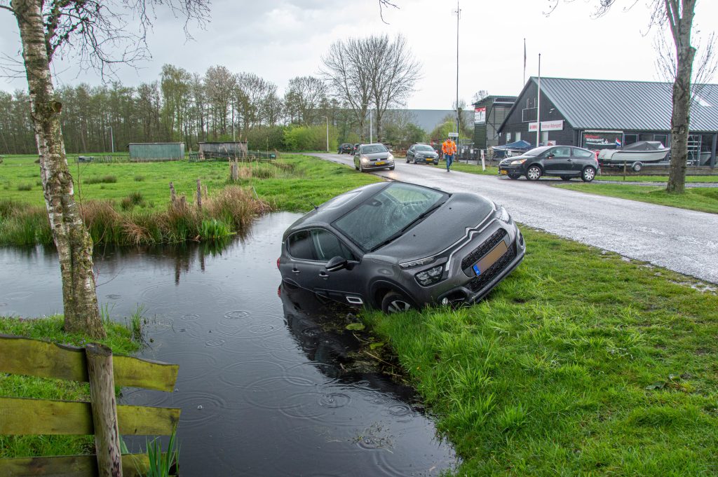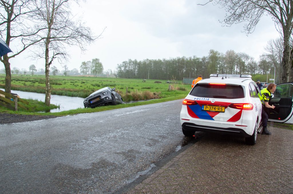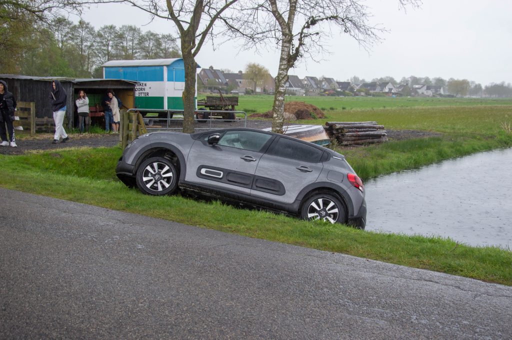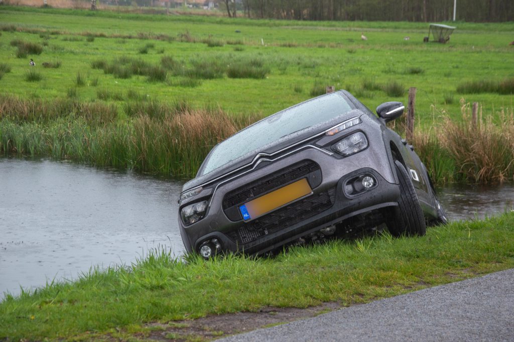 Door nog onbekende oorzaak raakte de auto achteruit in de sloot terecht waarop de bestuurder het voertuig nog net op tijd stil kon zetten voor deze volledig in het water terecht kwam.