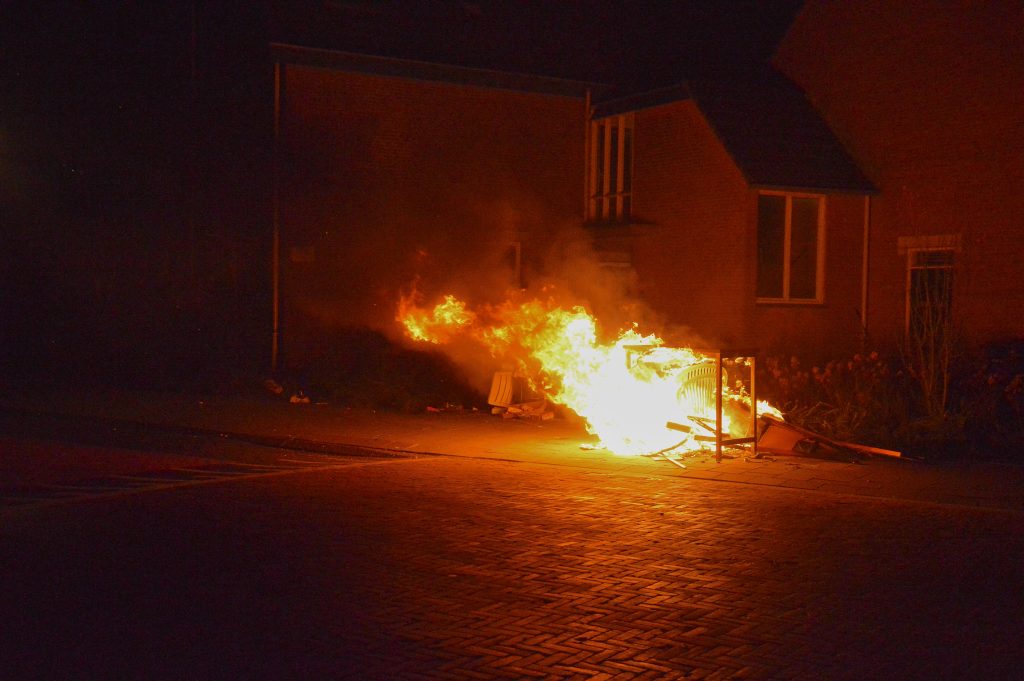 Op het kruispunt werden meerdere spullen in brand gestoken waaronder plastic tuinstoelen.
