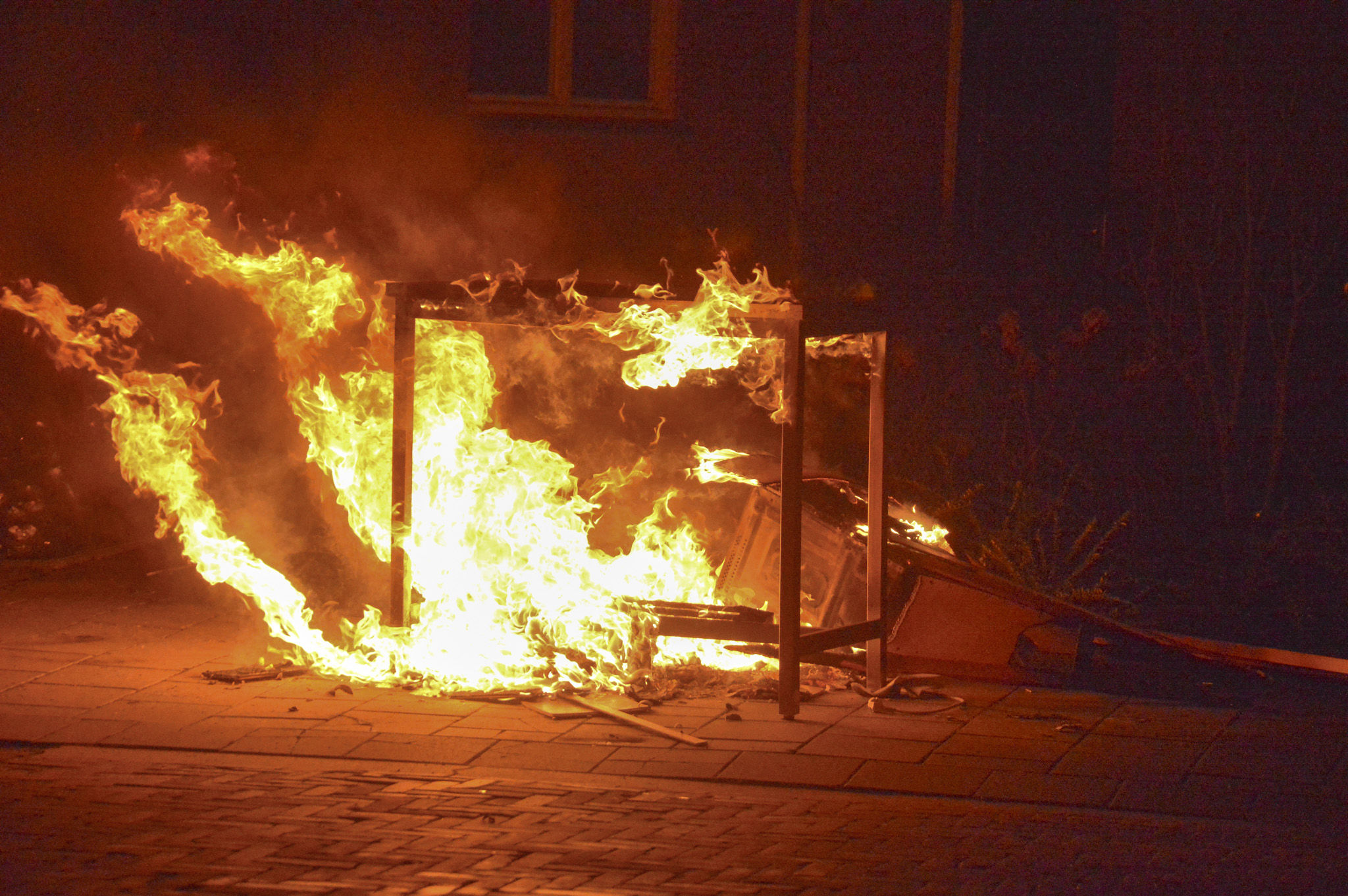 Op het kruispunt werden meerdere spullen in brand gestoken waaronder plastic tuinstoelen.
