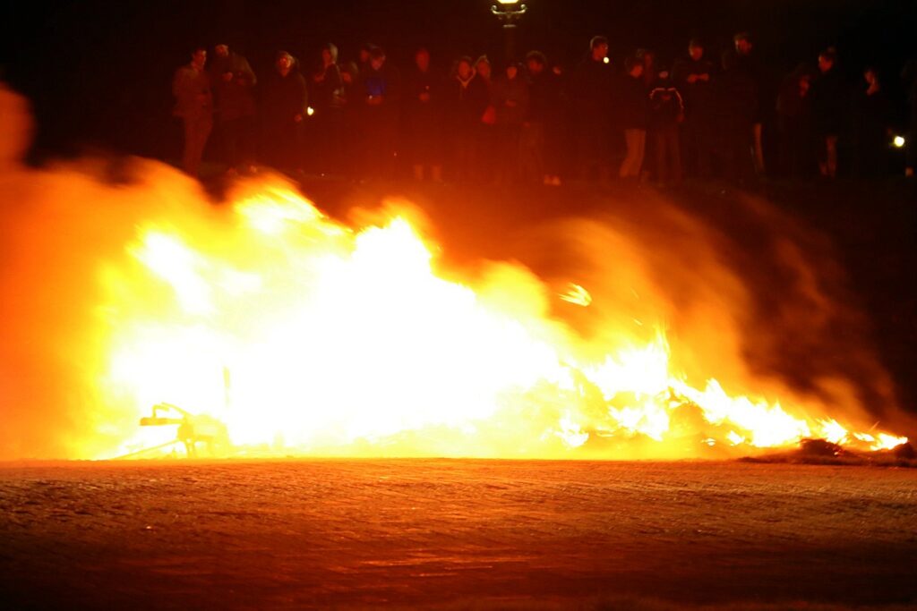 De brandweerlieden maakte gebruik van lage druk, waarbij het vuur met twee zogenoemde o bundels werd geblust. Dit gebeurde onder luid gejuich van tientallen toeschouwers.